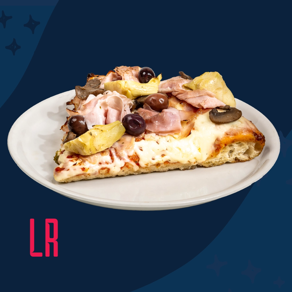 Pomodoro,ย mozzarella, carciofi,ย funghi Champignon, olive 1986 eย prosciutto cotto Gran Selezione inย cottura.