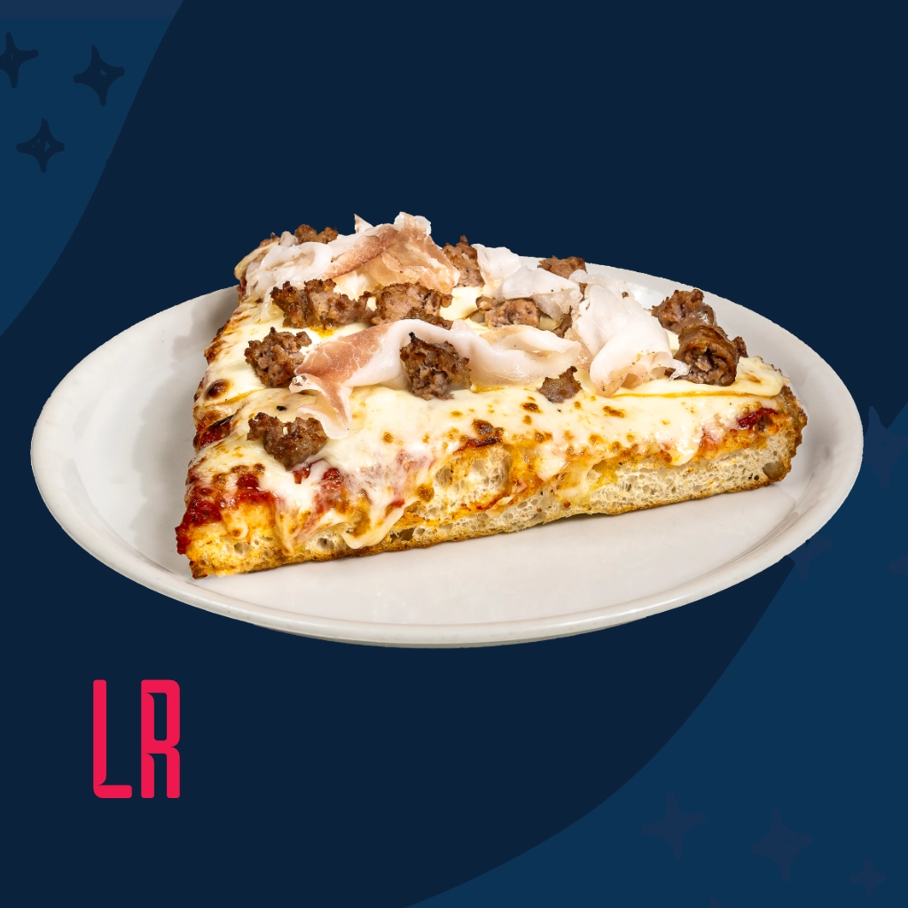Pomodoro, mozzarella, scamorzaย affumicata, salsiccia punta diย coltello e lardo colante.