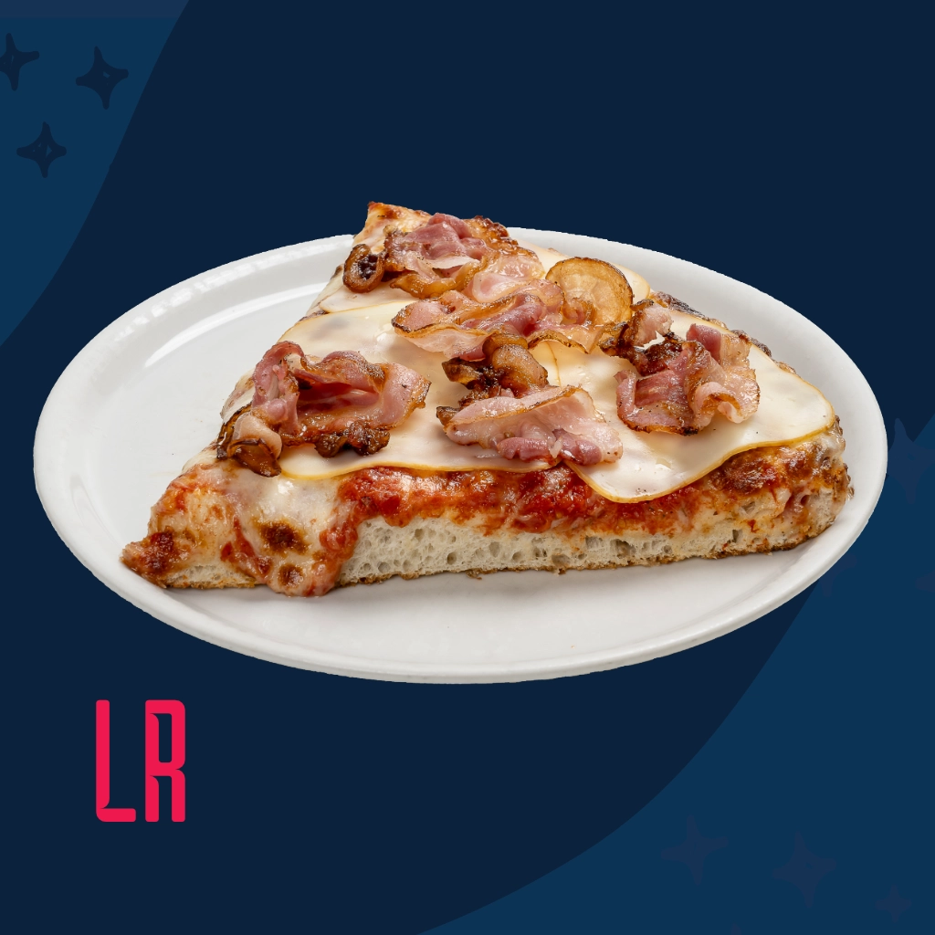 Pomodoro, mozzarella, scamorza e pancetta croccante.