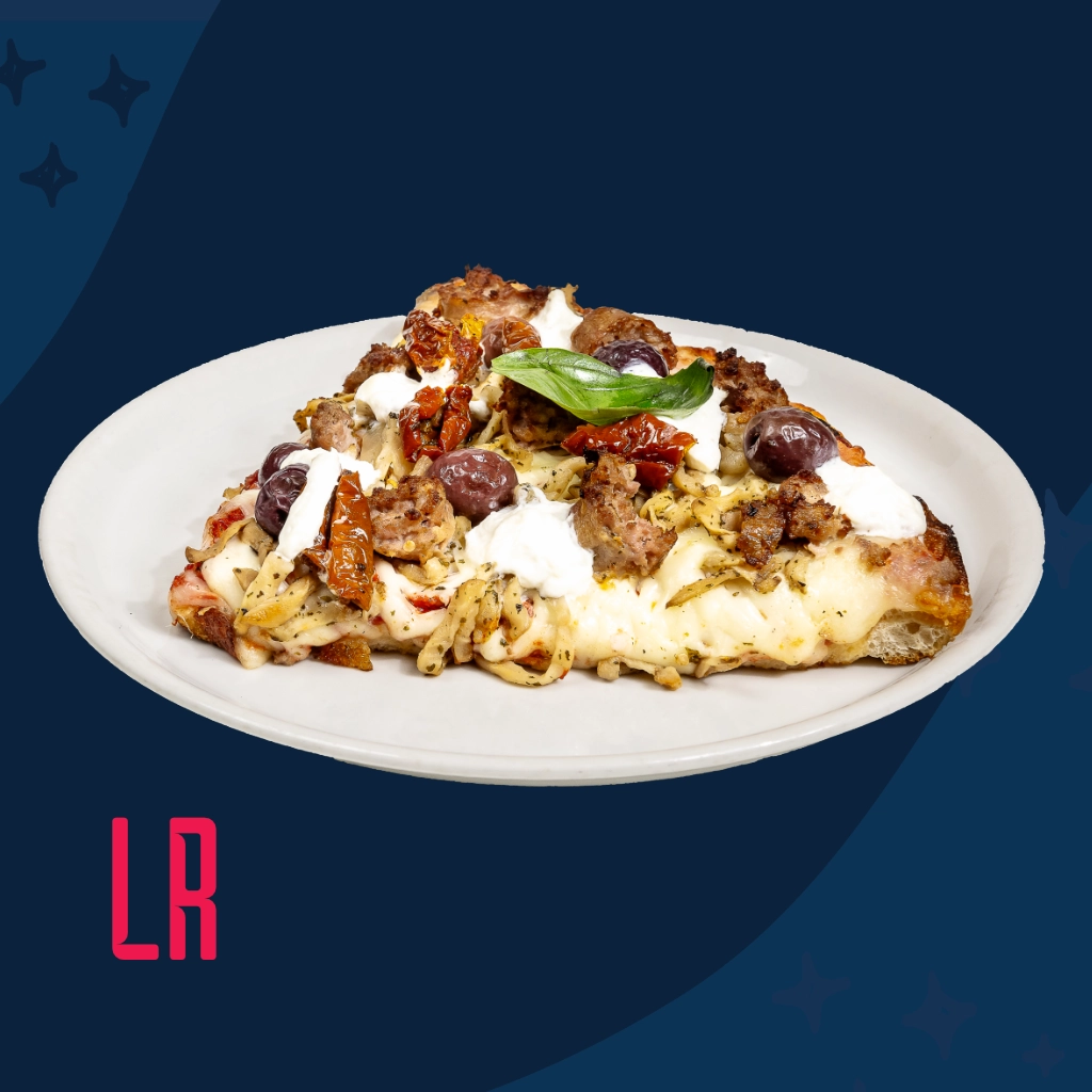 Pomodoro, mozzarella, melanzane del Gargano sottโ€™olio, pomodori secchi, salsiccia al finocchio, gustosa stracciatella pugliese e olive 1986.